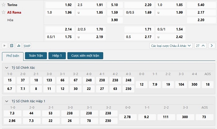Bảng tỷ lệ kèo bóng đá trận đấu Torino vs AS Roma
