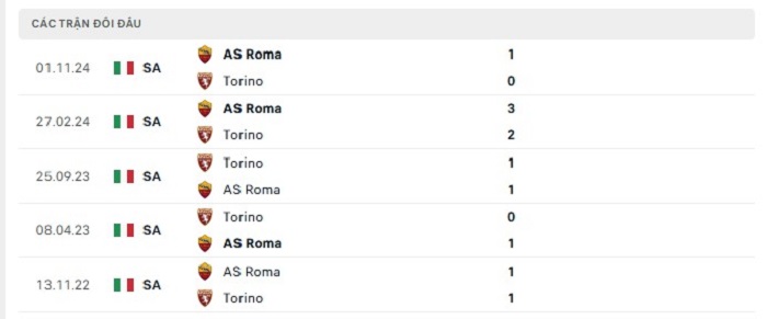Phong độ gần đây Torino vs AS Roma