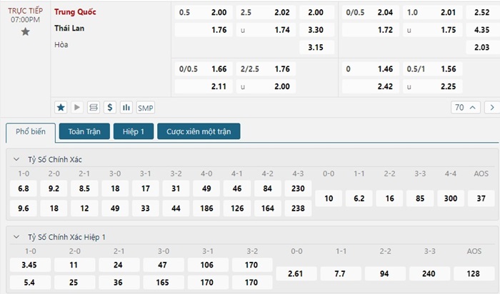 Bảng tỷ lệ kèo bóng đá trận đấu Trung Quốc vs Thái Lan