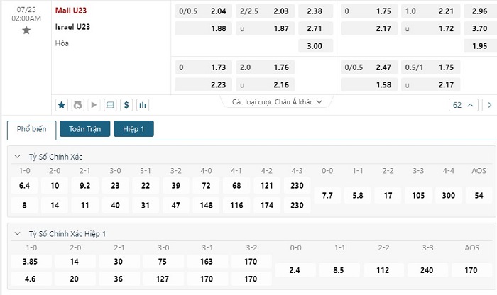 Bảng tỷ lệ kèo bóng đá trận đấu U23 Mali vs U23 Israel
