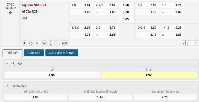 Bảng tỷ lệ kèo bóng đá trận đấu U23 Tây Ban Nha vs U23 Ai Cập