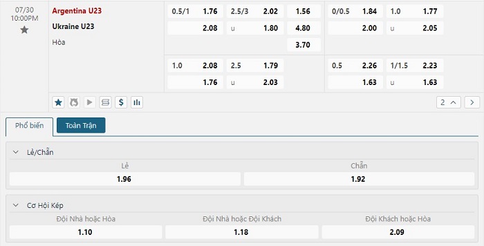 Bảng tỷ lệ kèo bóng đá trận đấu U23 Ukraine vs U23 Argentina