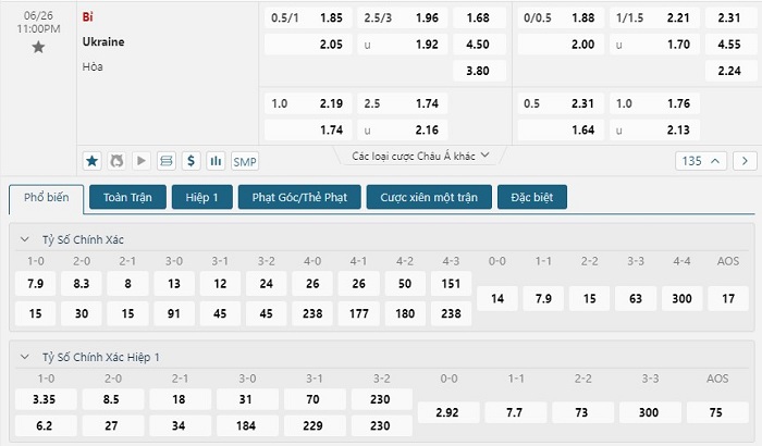 Bảng tỷ lệ kèo bóng đá trận đấu Ukraine vs Bỉ
