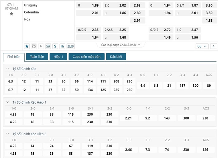 Bảng tỷ lệ kèo bóng đá trận đấu Uruguay vs Colombia