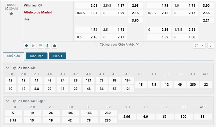 Bảng tỷ lệ kèo bóng đá trận đấu Villarreal vs Atletico Madrid