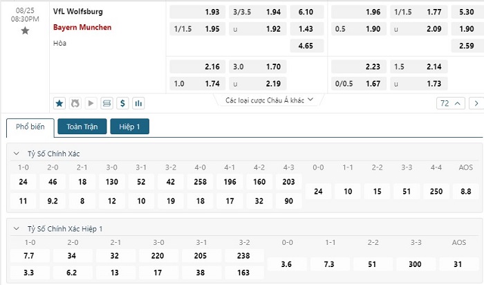 Bảng tỷ lệ kèo bóng đá trận đấu Wolfsburg vs Bayern Munich